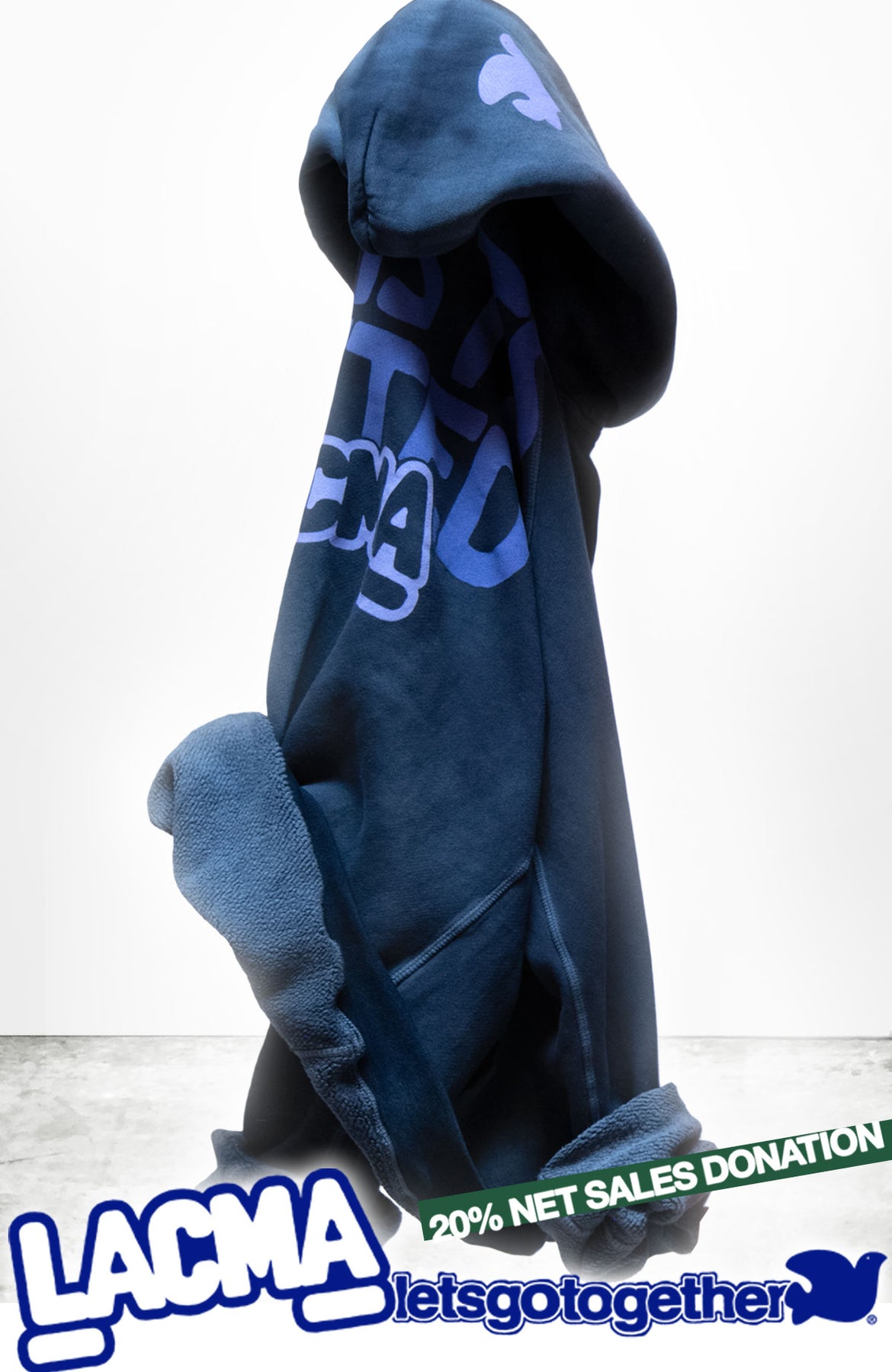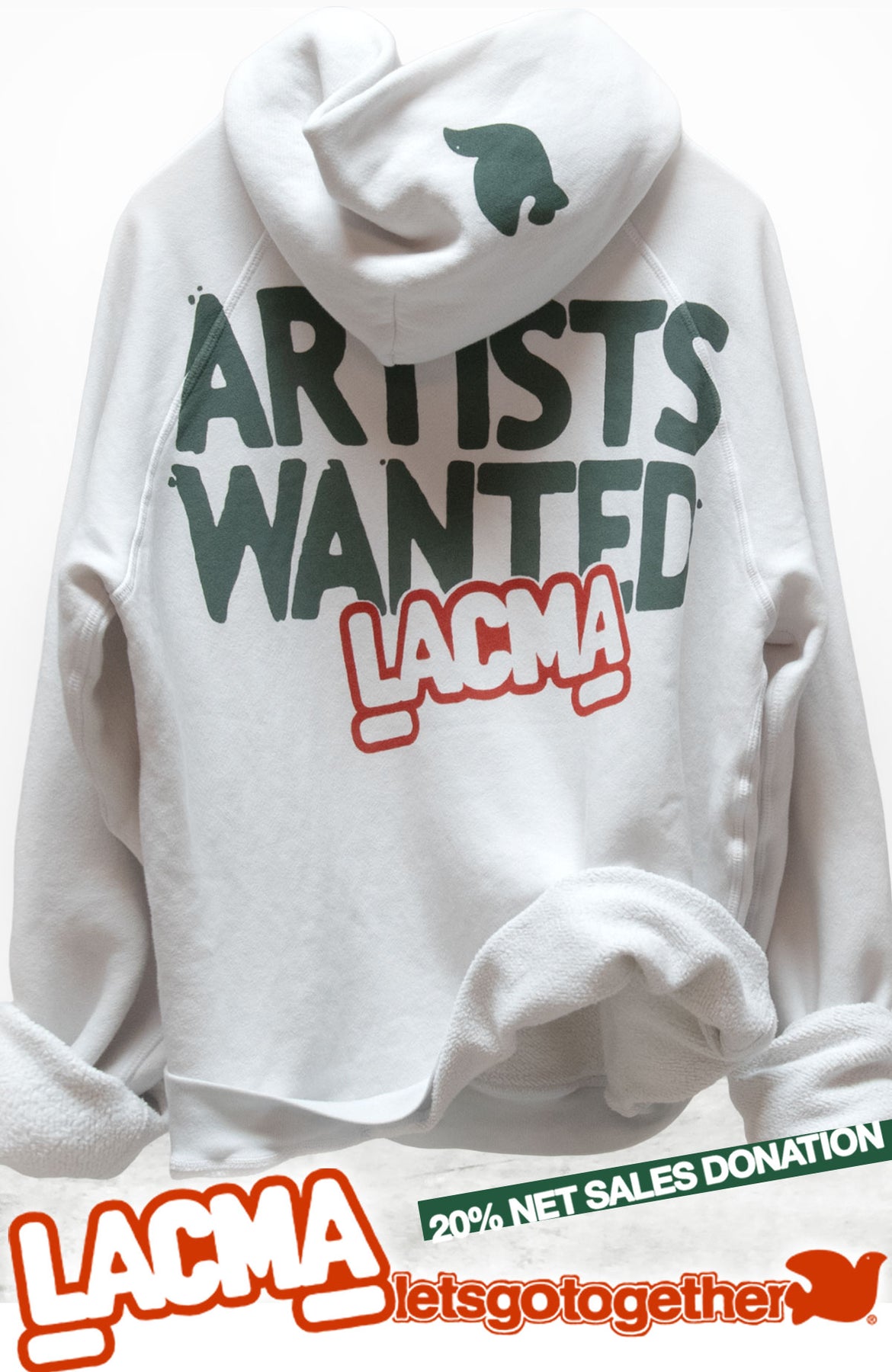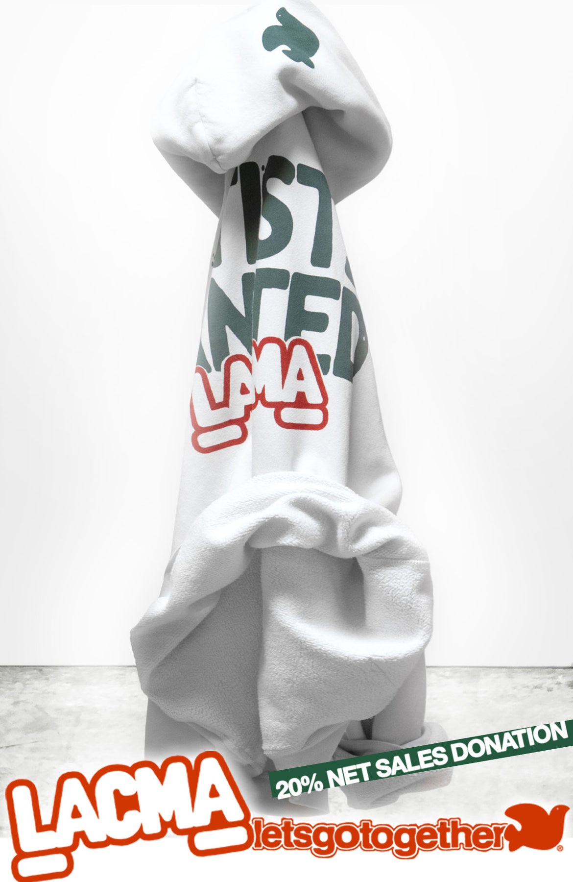 Unisex MID-WEIGHT SUPERVINTAGE pullover hoodie in laundry whites with hand-screened custom “LACMA ARTISTSWANTED” print on the back, “LACMA LETSGOTOGETHER” print on front, and “FEECITY DOVE” on hood. Hand-mixed paints. Easy fit with supersoft hand-feel. Made one by one. 100% custom. 100% FREECITY for LACMA.