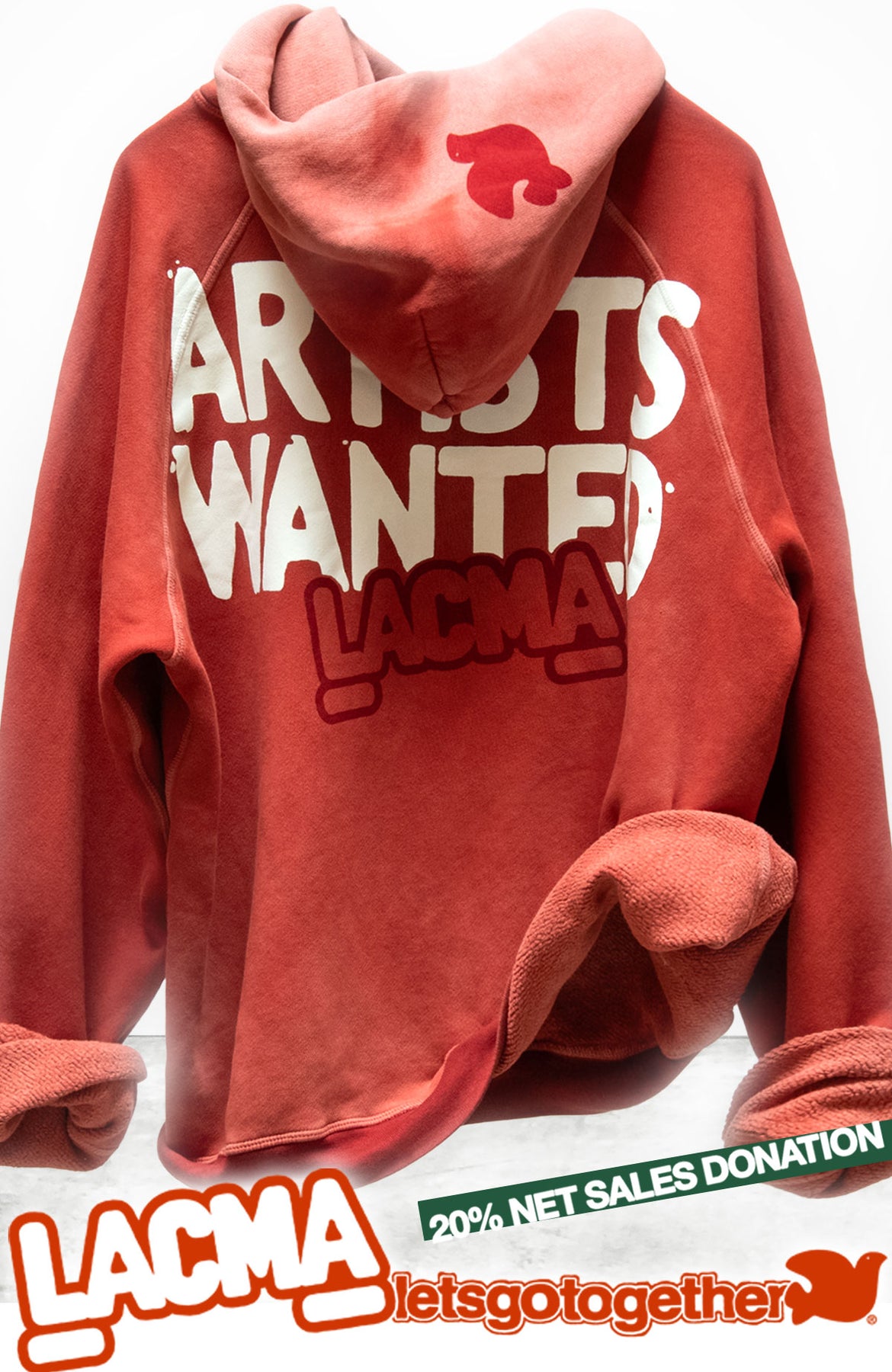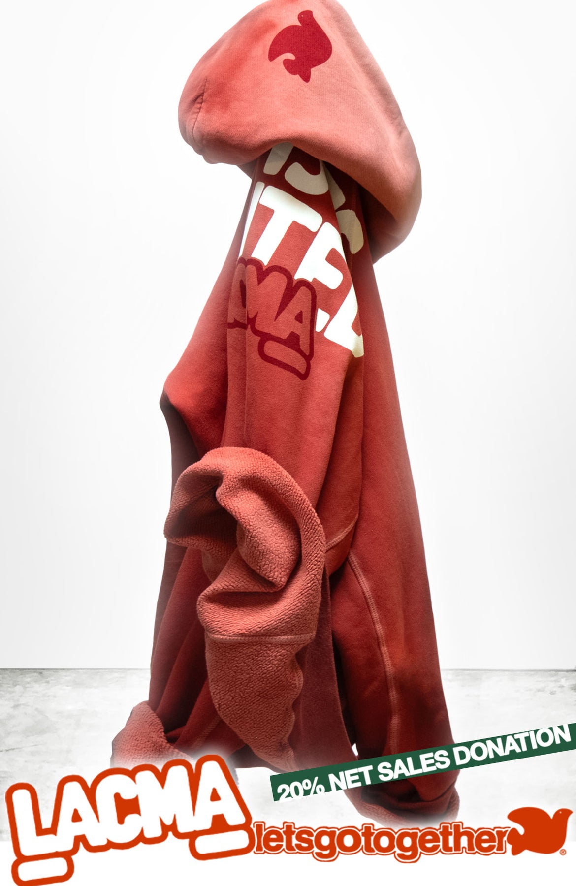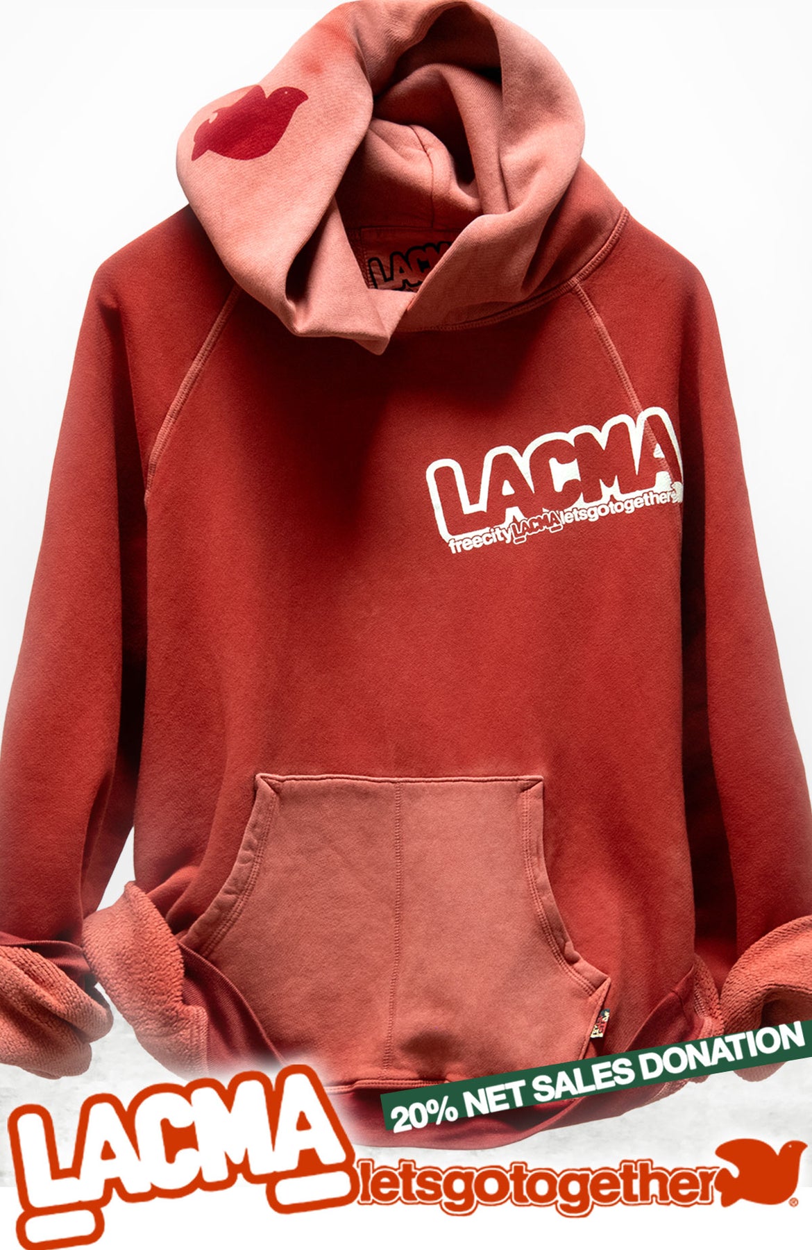 Unisex MID-WEIGHT SUPERVINTAGE pullover hoodie in orangeplant pigment-smash with custom sunfade dye process (highs and lows) hand-screened custom “LACMA ARTISTSWANTED” print on the back, “LACMA LETSGOTOGETHER” print on front, and “FEECITY DOVE” on hood. Hand-mixed paints. Easy fit with supersoft hand-feel. Made one by one. 100% custom. 100% FREECITY for LACMA.