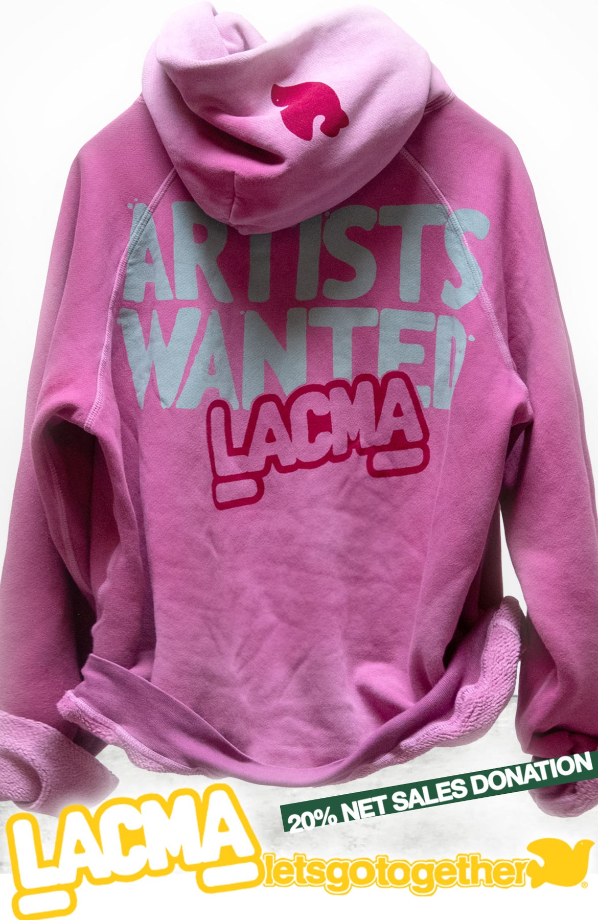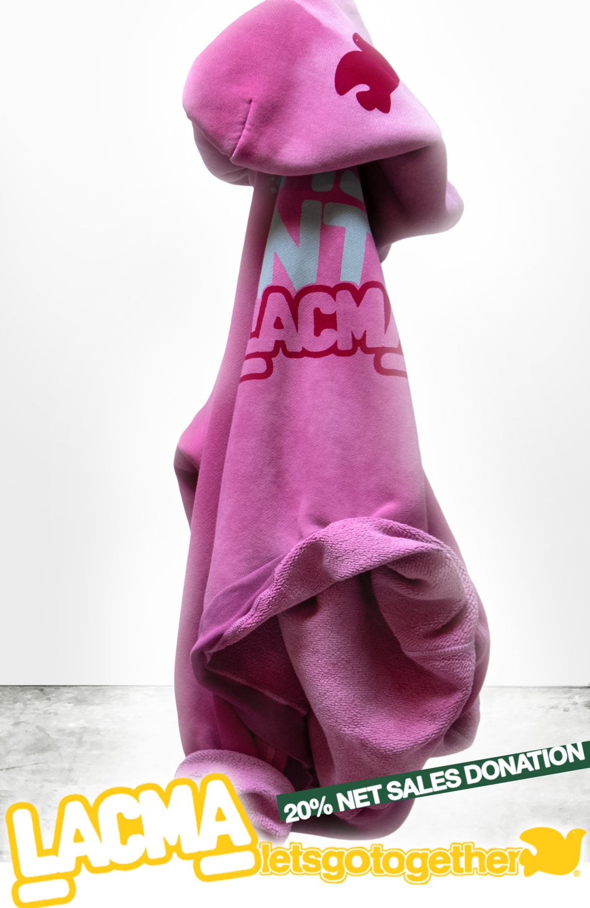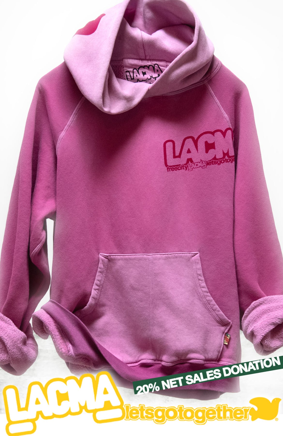 Unisex MID-WEIGHT SUPERVINTAGE pullover hoodie in pinkshroom pigment-smash with custom sunfade dye process (highs and lows) hand-screened custom “LACMA ARTISTSWANTED” print on the back, “LACMA LETSGOTOGETHER” print on front, and “FEECITY DOVE” on hood. Hand-mixed paints. Easy fit with supersoft hand-feel. Made one by one. 100% custom. 100% FREECITY for LACMA.