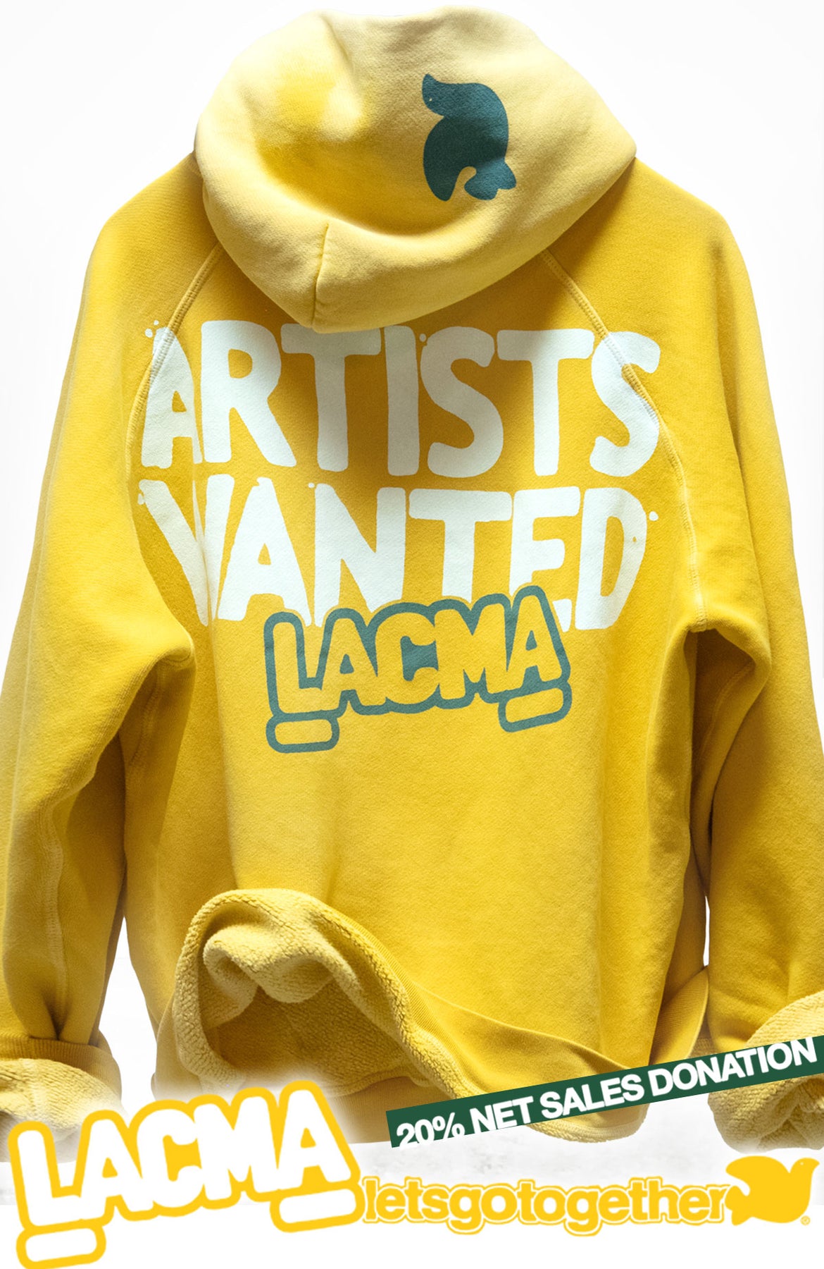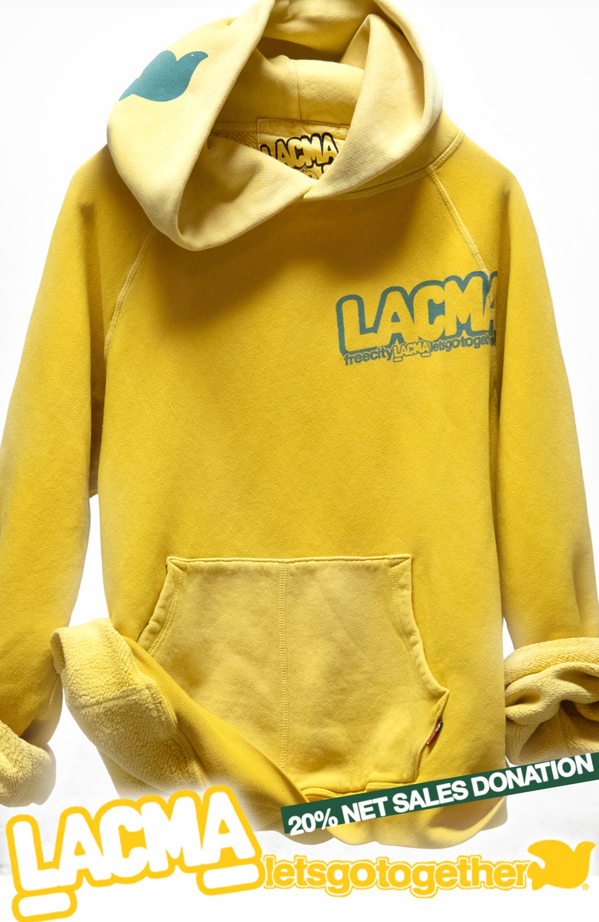 Unisex MID-WEIGHT SUPERVINTAGE pullover hoodie in yellowplant pigment-smash with custom sunfade dye process (highs and lows) hand-screened custom “LACMA ARTISTSWANTED” print on the back, “LACMA LETSGOTOGETHER” print on front, and “FEECITY DOVE” on hood. Hand-mixed paints. Easy fit with supersoft hand-feel. Made one by one. 100% custom. 100% FREECITY for LACMA.