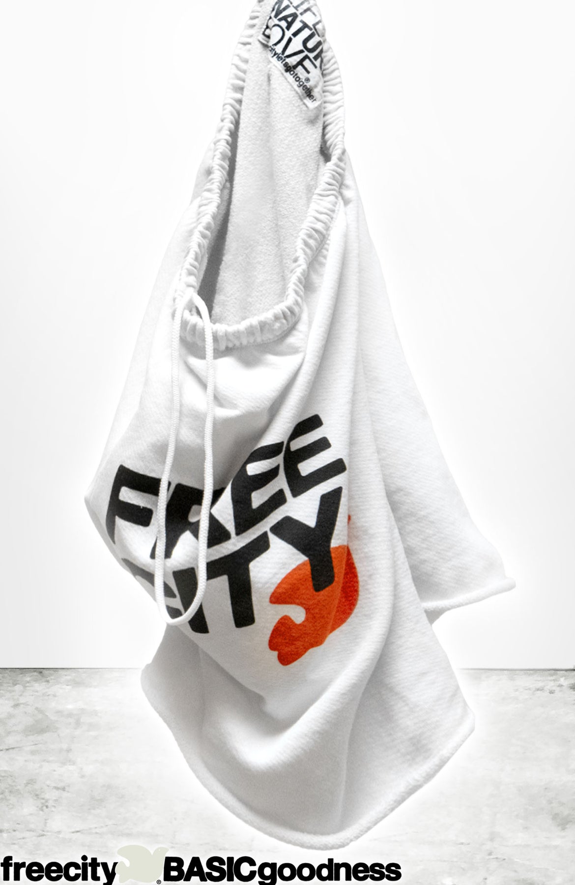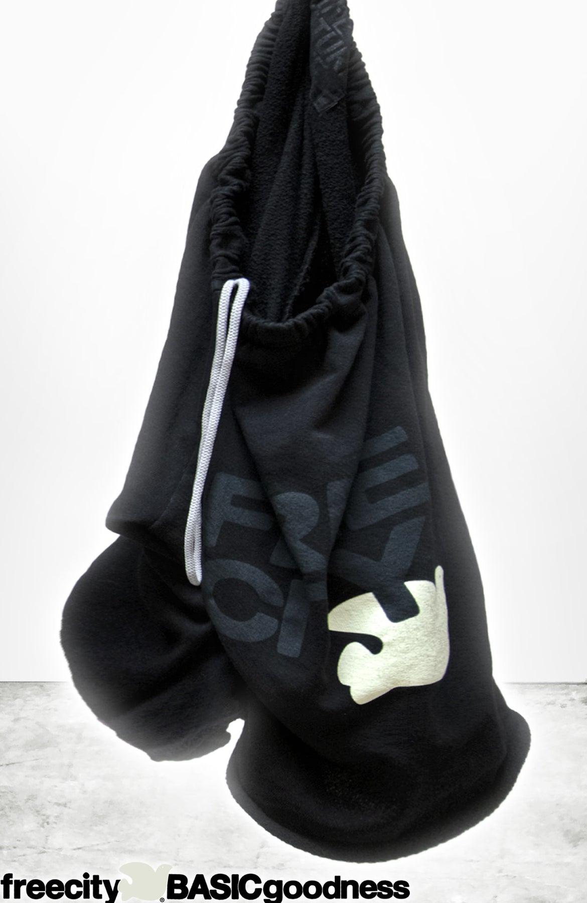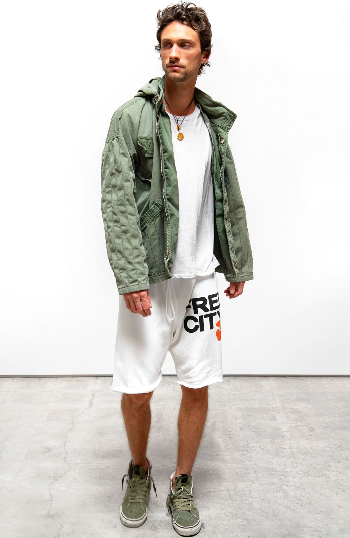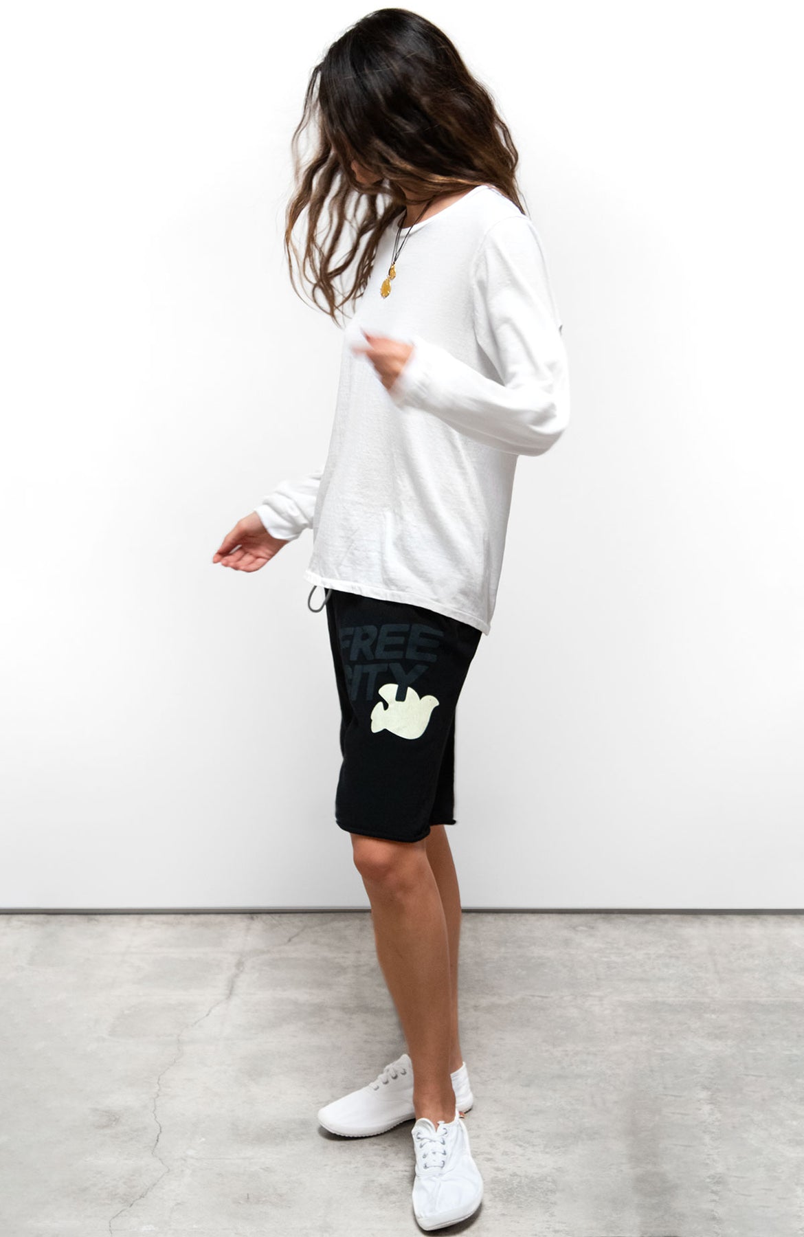 Unisex FREECITY cutoffs in superwhite with classic "FREECITY" print in black and "FREECITYDOVE" in orange, covered elastic waist, pull drawcord, and home/cut raw edge.