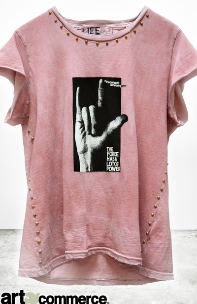 Oversized, unisex WONDERLAND SUPERYUMM CUTOFF hoodie in pinkdust powder with custom supersaturated sunfade dye process (highs and lows) hand-screen printed "WEAREALLBROKENHEARTED"  putty/blue block print on front, "THEDOINGOFITISTHEBEINGOFIT" print on the back, and cream "FREECITYDOVE" print on hood. HOME/STUD with vintage brass studs and grinding (distress) details at the hem.