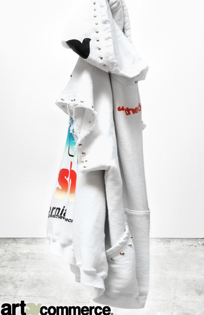 Oversized, unisex SUPERVINTAGE FREECITY SUPERSHOP YUMM CUTOFF hoodie in laundry whites with custom "ARTYARD SUPERSHOP" print on back with two separate on-screen hand-mixed fades, "THEDOINGOFITISTHEBEINGOFIT" print on the the front, and black "FREECITYDOVE" print on hood. HOME/STUD with vintage silver studs and grinding (distress) details at the hem.