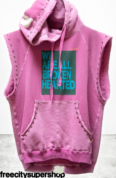 Oversized, unisex WONDERLAND SUPERYUMM CUTOFF hoodie in pinkdust powder with custom supersaturated sunfade dye process (highs and lows) hand-screen printed "WEAREALLBROKENHEARTED"  putty/blue block print on front, "THEDOINGOFITISTHEBEINGOFIT" print on the back, and cream "FREECITYDOVE" print on hood. HOME/STUD with vintage brass studs and grinding (distress) details at the hem.