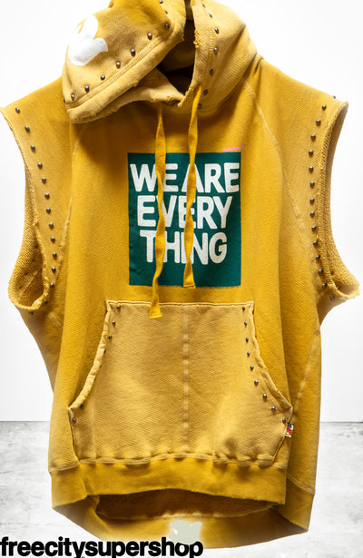 Oversized, unisex WONDERLAND SUPERYUMM CUTOFF hoodie in yellowplant powder with custom supersaturated sunfade dye process (highs and lows) hand-screen printed "WEAREEVERYTHING"  green/cream block print on front, "THEDOINGOFITISTHEBEINGOFIT" print on the back, and cream "FREECITYDOVE" print on hood. HOME/STUD with vintage brass studs and grinding (distress) details at the hem.