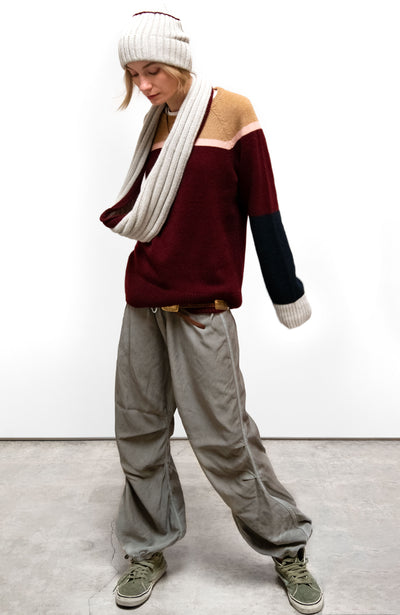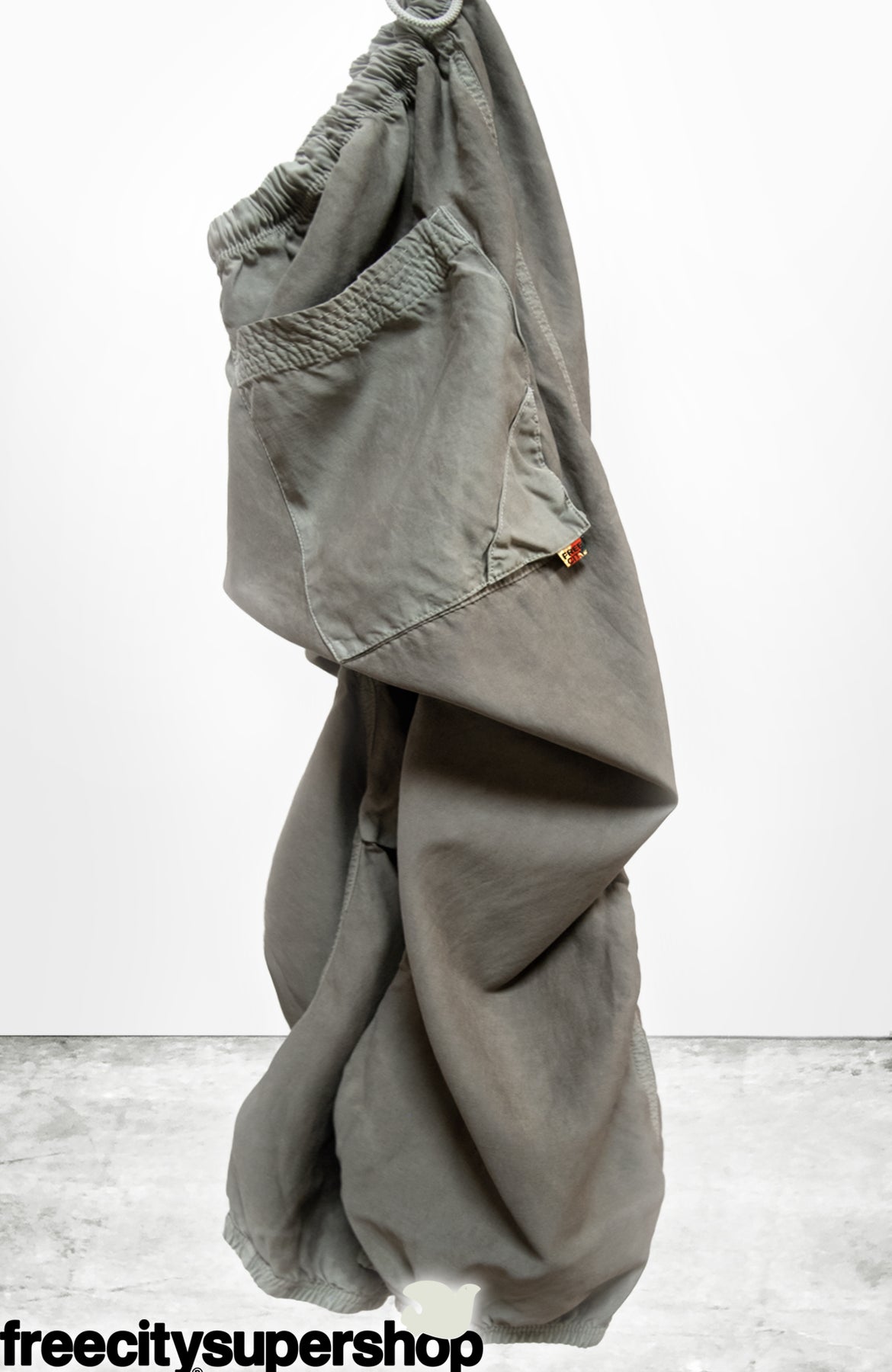 Unisex MATTE/SATIN LOOSE DRAWCORD BIGGY in mud powder with custom sunfade wash (highs and lows) custom 3d back-pocket, knee pleats, loose elastic bottom, and covered elastic waist with pull draw-cord.